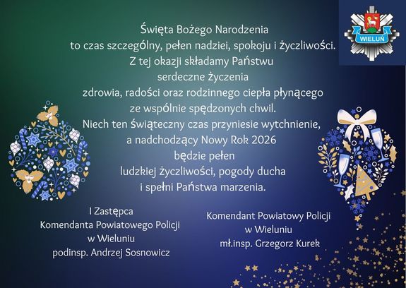 Przed nami wyjątkowy okres - Święta Bożego Narodzenia. Na ten niezwykły czas, Komendant Komendant Powiatowy Policji w Wieluniu młodszy inspektor Grzegorz Kurek w imieniu własnym oraz kadry kierowniczej wieluńskiej jednostki składa funkcjonariuszom, pracownikom Policji oraz mieszkańcom naszego regionu serdeczne życzenia.