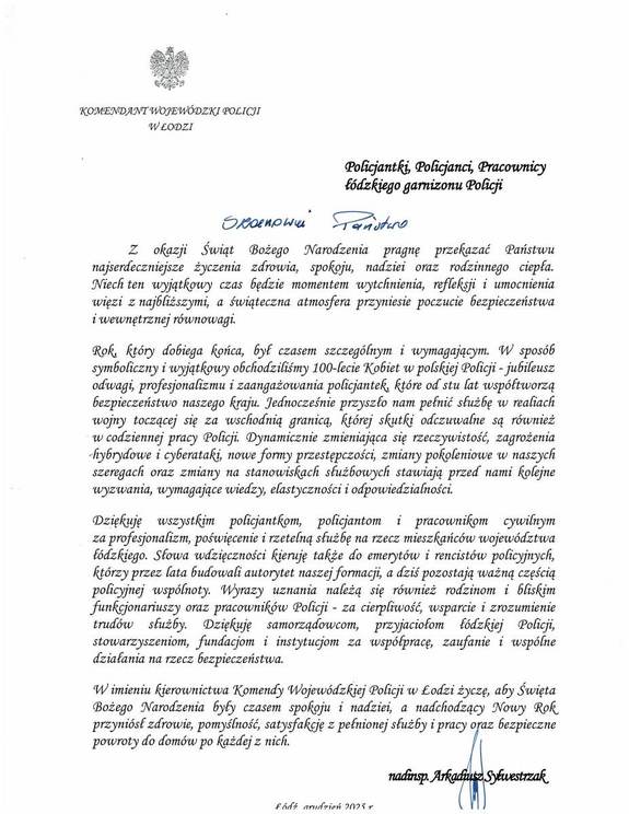 "W imieniu kierownictwa Komendy Wojewódzkiej Policji w Łodzi życzę, aby Święta Bożego Narodzenia były czasem spokoju i nadziei, a nadchodzący Nowy Rok przyniósł zdrowie, pomyślność, satysfakcję z pełnionej służby i pracy oraz bezpieczne powroty do domów po każdej z nich. "